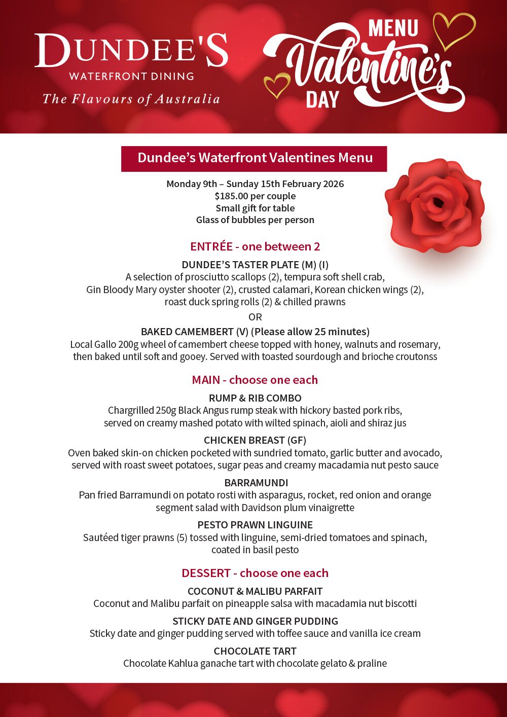 Valentine’s Day may fall on 14 February, but romance doesn’t have to be limited to one night. At Dundee’s on the Waterfront in Cairns, our special Valentine’s Day menu is available from Monday 9th to Sunday 15th February 2026.